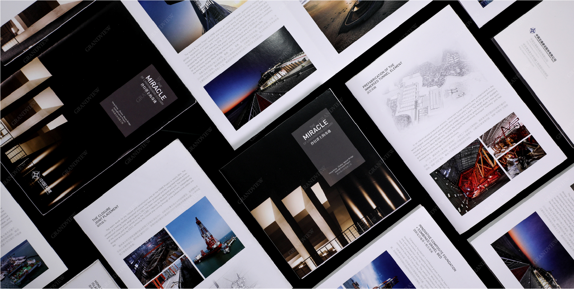 畫冊圖片以藍色為主色調(diào),與主題《伶仃洋上的奇跡》遙相呼應;多采用大跨頁精美圖片,形成強烈的視覺沖擊;板塊清晰、結構完整、既能全方位概括,又有重點突出,將島隧工程完美展現(xiàn)。